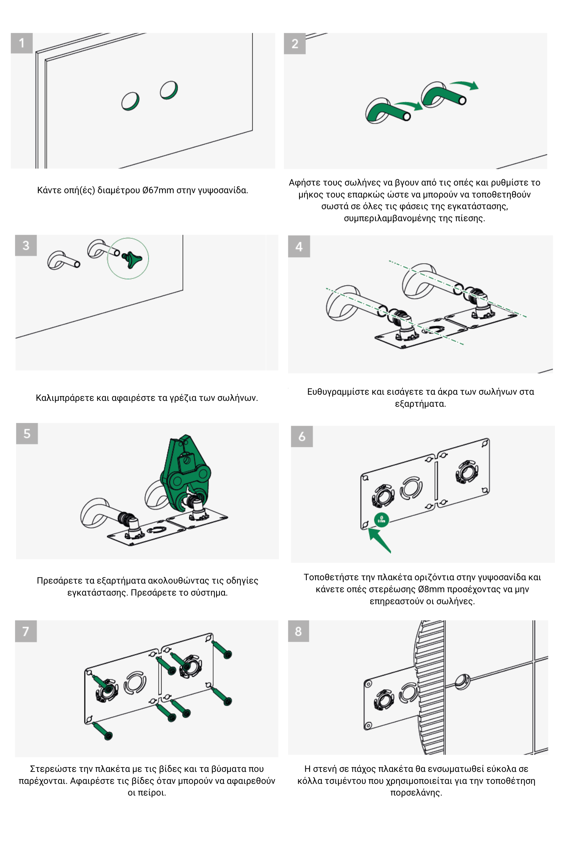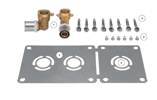 Πρόκειται για ένα σετ που αποτελείται από έναν συναρμολογούμενο πίνακα από γαλβανιζέ χάλυβα με ενδοοριζόντια πλάκα 150mm για τυπικές βρύσες και 60mm για συνδέσεις κάτω από νεροχύτη, βρύσες τουαλέτας ή πλυντηρίου, όπου χρησιμοποιούνται δύο συνδέσεις με εξαγωγή πίεσης 90° θηλυκές ½" 16x2.